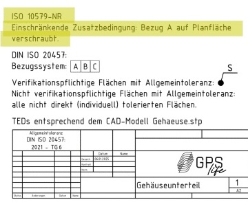 Im folgenden Bild ist die Fläche eines Bauteils mit einer Ebenheit im freien Zustand toleriert. Es ist zu erwarten, dass die mit der Eintragung versehene Fläche durch die Montage eine zusätzliche wesentliche Verformung bekommen wird. Die Bewertung im „freien“ Zustand bietet eine Möglichkeit, bereits vor der Montage die entstandenen Verformungen zu erkennen, um eine spätere Funktionserfüllung beurteilen zu können.
